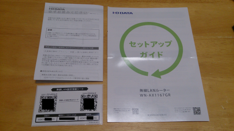 ドライバCDなどもありません。設定シールはかなり大きいものです。本体はシンプルなデザインなので、この大型のシールを張って使うのはためらいがあります。携帯などで設定するにはQRコードは便利そうです。