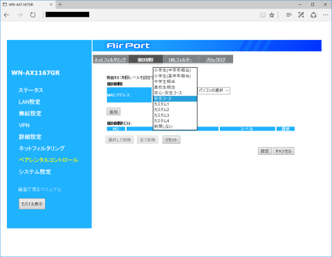 別途URLのフィルタも可能です。機器ごとではないので、まとめて見られなくなります。子供がエロサイトを見ているのをお母さんにフィルタリングかけられると、お父さんも巻き添えになります。