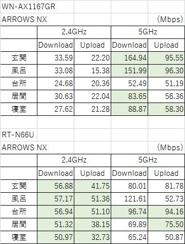 結果としてはNexus 5だと全般的にRT-N66Uの方が速かったり、ARROWS NXの5GHzだとWN-AX1167GRの方が速かったりと、圧倒的な違いということにはなりませんでした。