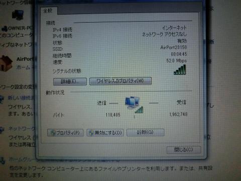 WN-G300Rの通信状態:「ワイヤレスネットワークの接続」を見ると、速度は52~58Mbpsで推移。