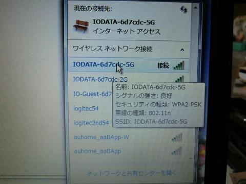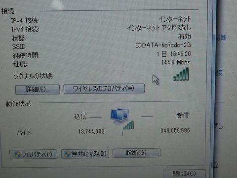 WN-AX1167GRの通信状態:2.4GHzでは、「ワイヤレスネットワークの接続」を見ると、速度は (IODATA-6d7cdc-2G) 87~144Mbps。シグナルの強さは「非常に強い」と出ています。
