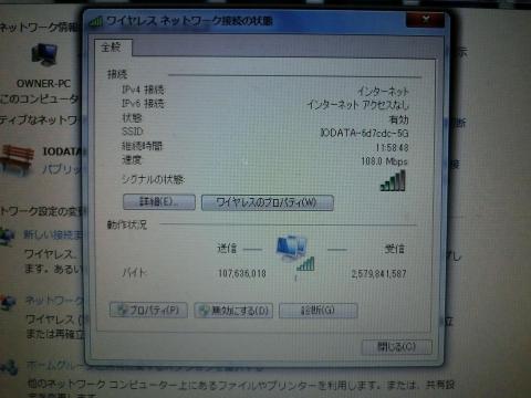 5GHzでは、「ワイヤレスネットワークの接続」を見ると、速度は 108~162Mbps。シグナルの強さは「良好」と出ています。