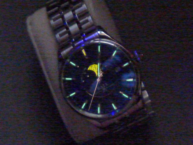 12時のインデックスが暖色系で、他は寒色系に発光するので時間を見間違うこともない。ムーンフェイズも全面トリチウムで発光するので、これまた12時の方向が見やすく、綺麗です。