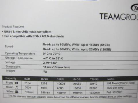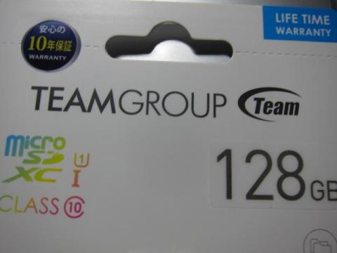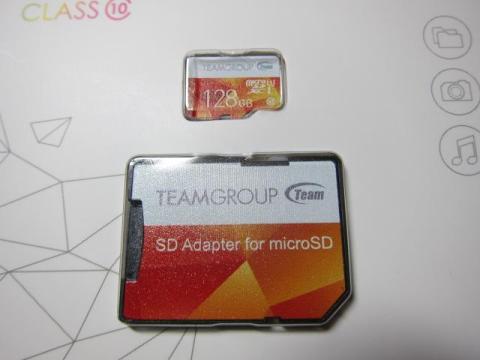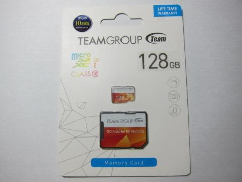 TEAMの128GB,UHS-1対応のmicroSDカード,同一デザインの変換アダプタ付きです.
