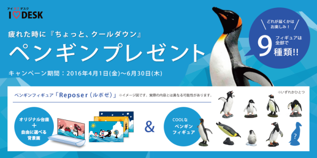 企画第1弾である「Reposer(ルポゼ)」(フランス語で“休息させる”の意味)プレゼントキャンペーンは、長時間のパソコン作業の合間にクールダウ ンいただける癒しグッズとして、ハイクオリティなホビーフィギュアの造形メーカーでもある株式会社海洋堂が制作した、ただかわいいだけではなく豊富な知識 に基づいたペンギンフィギュアと専用スタンドのセットを応募者全員に無償提供いたします。