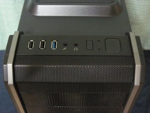 フロントアクセスはUSBx2、USB3.0x1、マイク、ヘッドフォン、リセットスイッチ、パワースイッチが上部に並ぶ。