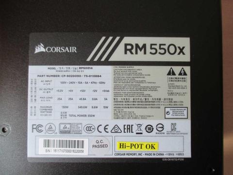 入力電圧 100-240VAC 入力周波数帯 47Hz-63Hz 入力電流 10A-5A DC出力 +3.3V +5V +12V -12V +5Vsb 25A 25A 45.8A 0.8A 3A 130W 549.6W 9.6W 15W 定格出力 550W↓反対側は上下さかさまになるポジションでシールが貼られています。