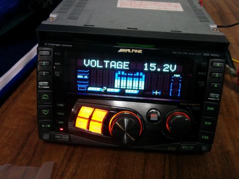 今回はどれだけ電圧の出力があるか、カーステに繋いでみました。