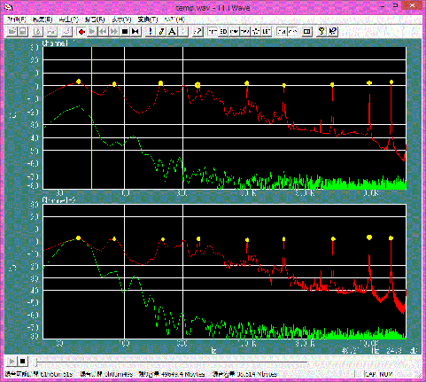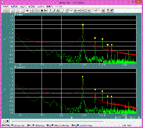 1KHz基準信号を再生した時の高調波(2次、3次...) 奇数次高調波が多いと歪が多い 音楽を再生しても高調波も再生されるわけでそれらが一体となって音楽として再生されるわけです アナログの世界は複雑ですね...