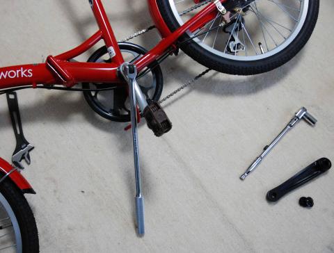 自転車を倒してペダルを固定して、15mmの差し込み角3/8インチのソケット駒に1/2インチの変換駒を付けて差し込み各1/2インチのスピンナハンドルでなんとか緩めました