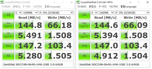 USBメモリのシリアル番号が新しいので、スペックが更新されたのか、測定したPCのOSをリフレッシュしたためか、Crystal Disk Markで若干速くなっています。