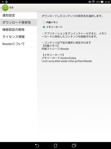 これがZenPadS8.0だと書籍の保存先にMicroSDを選択できるようになっています。