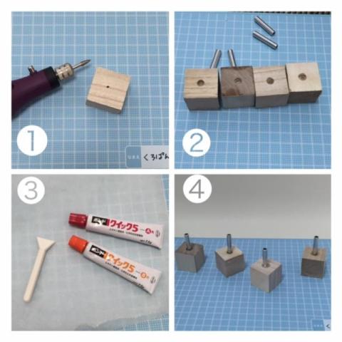 ①リューターで木片に穴をあける(パイプの面取りもリューターでしました)