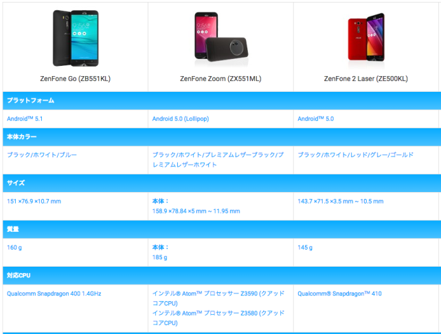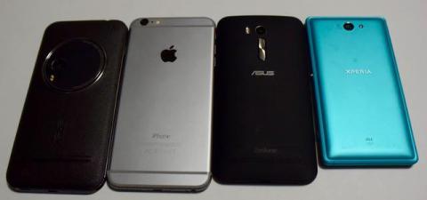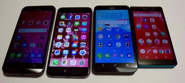 左からZenFone Zoom, iPhone6 Plus, ZenFone Go, XperiaZL2 SOL25