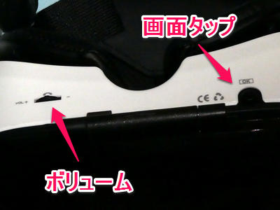 ゴーグルの下部にはイヤホンの音量調整ダイヤルと、セットしたスマホの画面をタップするためのボタンがあります。