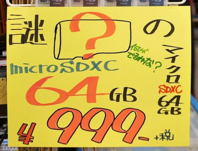 店頭には、謎のmicro SDXC 64GB 何が出るかな?というとても怪しいPOPが貼られていています。