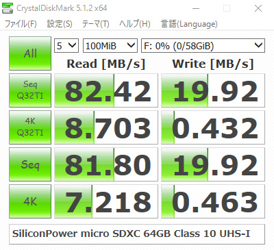 Crystal Disk Markを走らせると、パッケージに記載の、Read Upto 85MB/sとはいきませんでしたが、コンパクトデジタルカメラには充分な性能だと思います。