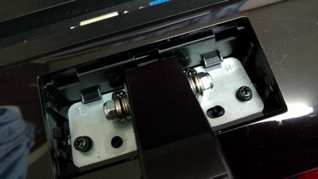 BenQモニタ。左右のネジをはずして真ん中の穴をとがったもので突いてひっぱると外れます。