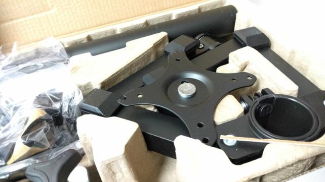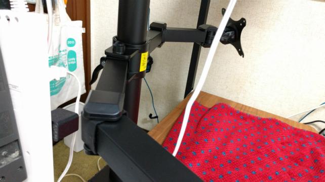 ここからは体力が必要。3キロ×2モニタとアーム分8キロくらい持って支柱に挿します。