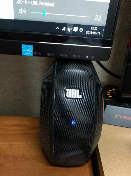 モニタちょっと上めにあげたらデスク上におけなかったJBLスピーカーがおけました。