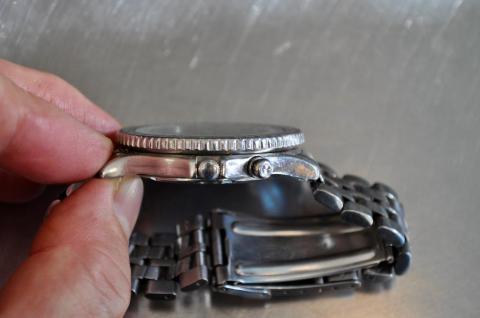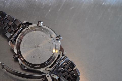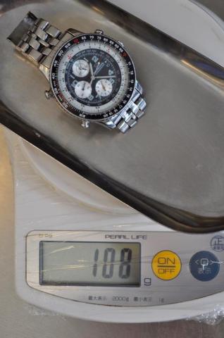 ロック機能付き金属ブレスですが、斜めに配されたコマは、ここでも明らかにブライトリング・オールドナビタイマーへの憧れ(真似)が見て取れます。