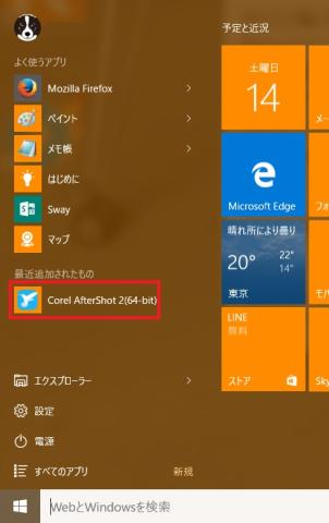そこで、メニューの”Corel AfterShot 2(64-bit)”をクリックして起動。