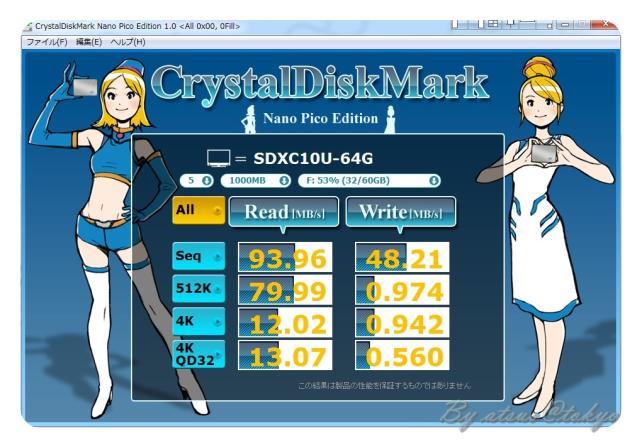 SDカードの仕様が読み出し最大 90MB/秒、書き込み最大 45MB/秒ですので、上回った数値が出ました(^^