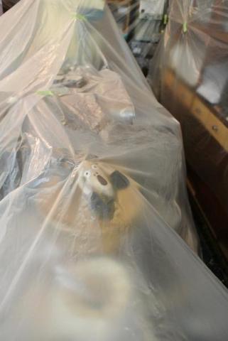 天井部もローラーで作業してもらいます。 養生の透明シートの下で叫ぶ人がいました。