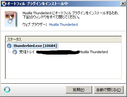 オートフィルプラグインインストール時に対応するソフトが起動中の場合以下のダイアログが表示されます。手動でソフトを終了させると以下のダイアログは自動で消えます。