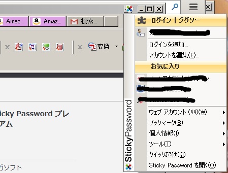 登録方法は一つはStick Passwordが起動状態中にパスワード入力を行うことで自動的にパスワード登録ダイアログが表示されて、保存確認が行われる。もう一つは最小化ボタンなどの左隣追加されるStick Passwordボタンを押下することで表示されるドロップダウンメニューからログイン追加を選択することでパスワード登録ダイアログが表示される。