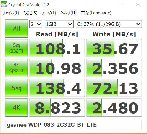 内蔵eMMCの詳細情報はわかりませんでしたので、速度だけ掲載しておきます。