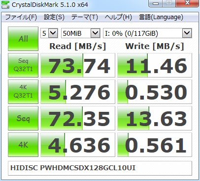 シーケンシャルリード 約73MB/s。シーケンシャルライト 約11MB/s。
