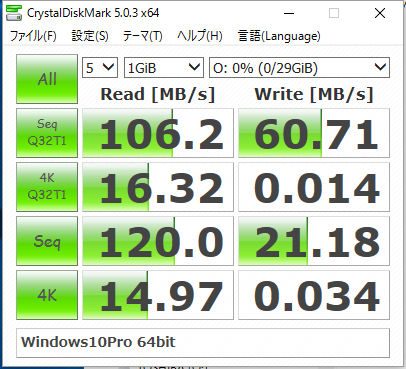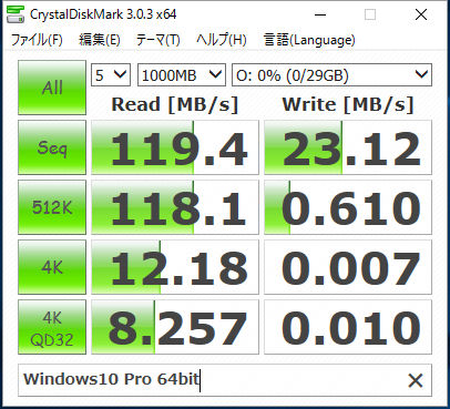 ほぼ120MB/s出ていますが、ライトは根本的に遅いです。