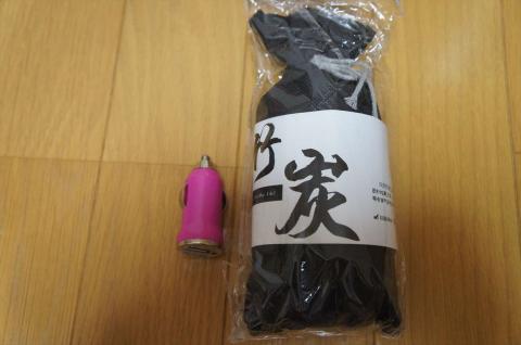 USBカーチャージャーと竹炭が付属しています。この竹炭は、この機械に使うものではありません。車内の隅にでも置いておけば、消臭効果があります。
