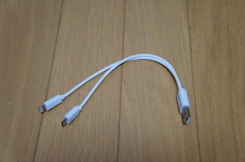 モバイルバッテリーで使うための、2in1ケーブルも付属しています。MicroUSBとLightningです。