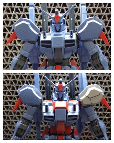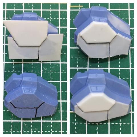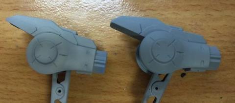 肩のパーツは一度表面を平らに削り落としてからプラ板工作で形状を作りなおしてあります。