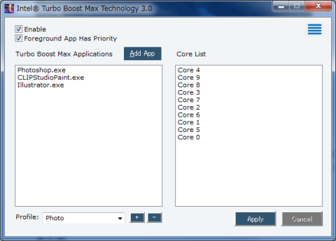 GIGABYTE GA-X99-Designare EXの場合は単独のソフトになっている。GIGABYTEの付属ソフトとはデザインが全く異なるので恐らくコチラがインテル純正そのままのなのだろう。どちらもやる事は同じで優先させたいソフトを登録するだけ。登録していなくてもForeground App Has Priorityにチェックが入っていれば4GHzまでの上昇を確認した。以下TBはPhotoshop最優先で設定済み。