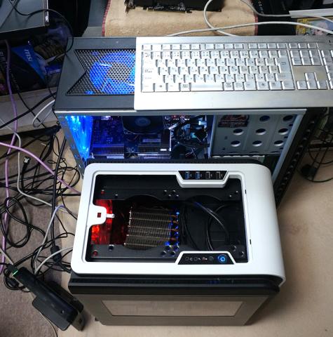奥のP183がE5、手前のDS CUBEがi7。という訳でi7-6950X≒E5-2670+i7-2700Kと収まったんだけど…2台でも操作結構キツいわ!