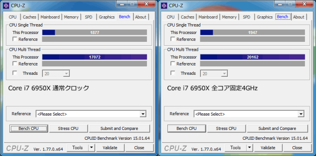 ただTBの動作にはムラがあるようで何回かベンチを回すと数値は1700~1870程度で前後する点に注意。今回はもっとも伸びたスコアを採用。全コア4GHz設定(XMPで勝手になった)でまわすとシングルで1947。マルチだと20000オーバーという圧倒的なスコアだ。