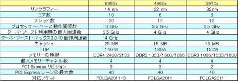動作周波数も下がってますが、Core™ i7-4960XはIby Bridge Eだったのが今回のBroadwell Eに変わっていますので単純に動作周波数だけでは比較できませんね。