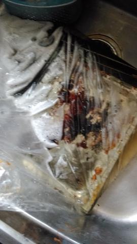 キッチンペーパーは油汚れがおちて移った感じ。触ると危ないのでビニール袋に入れてごみとして捨てる