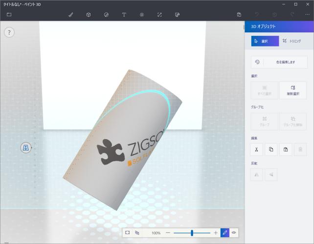 円筒状の筒にZigsow logoを貼り付け、3D空間の位置を移動させているシーンです。