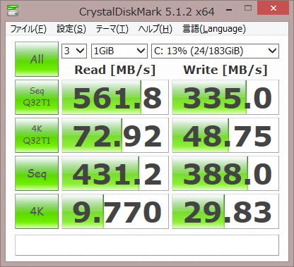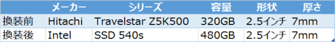 あまり意味はないかもしれませんが、換装前のHDDと「INTEL SSD 540s」を比較してみました。ベンチマークについては、OSがインストールされている同じ条件で測定したいので後程、紹介します。