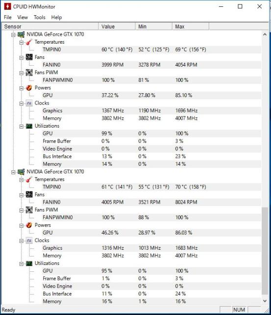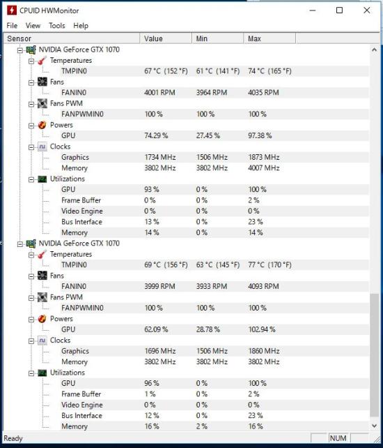 これはGPU演算を開始直後のもので、定格のまま長時間連続演算するとこのGPU温度では済まないです。最大77℃にも達します。ファン回転は本当にもういっぱいいっぱいですね。もっと冷却性能に余裕が欲しかったです。