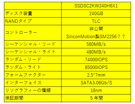 さて今回はプレミアムレビューとは違い、240GBのSSDSC2KW240H6X1となるので