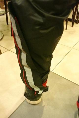 シトシト降る雨でしたので、前身頃のベルクロテープを開放して、赤いラインを出して視認性を高めたそうです。