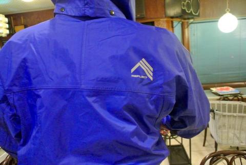 フードに隠れている襟部にひとつ、右側肩甲骨部分にひとつ、両足に反射テープが用意されています。