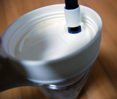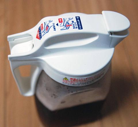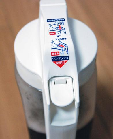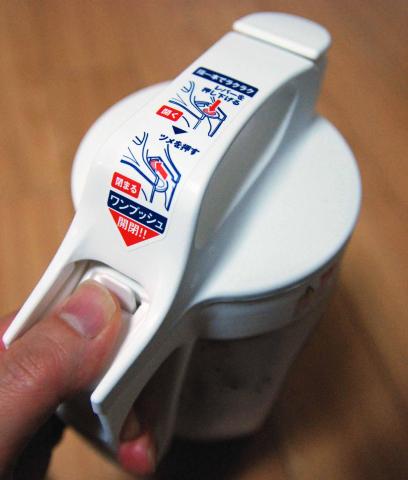 大きな蓋上の部分はねじ込み式ですが、取っ手のボタンを押して注ぎますが、ボタンのリリースはボタンの奥のボタンを更に押さないと閉まりません