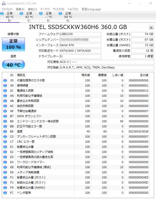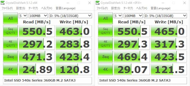MLCとTLCと仕様は異なりますが、インテル(R) SSD 540s シリーズは、以前のプレミアムレビューで、2.5inch版をノートPCに換装させて戴いていて、パフォーマンスも確認していたので、SSD容量が、240GB > 360GBに容量アップしたので大歓迎でした。