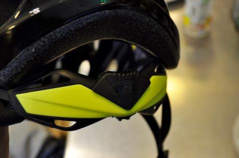 これはヘルメット後端下部にあたる部位です。 黄緑色のV型の頂点にダイヤルが備わっており